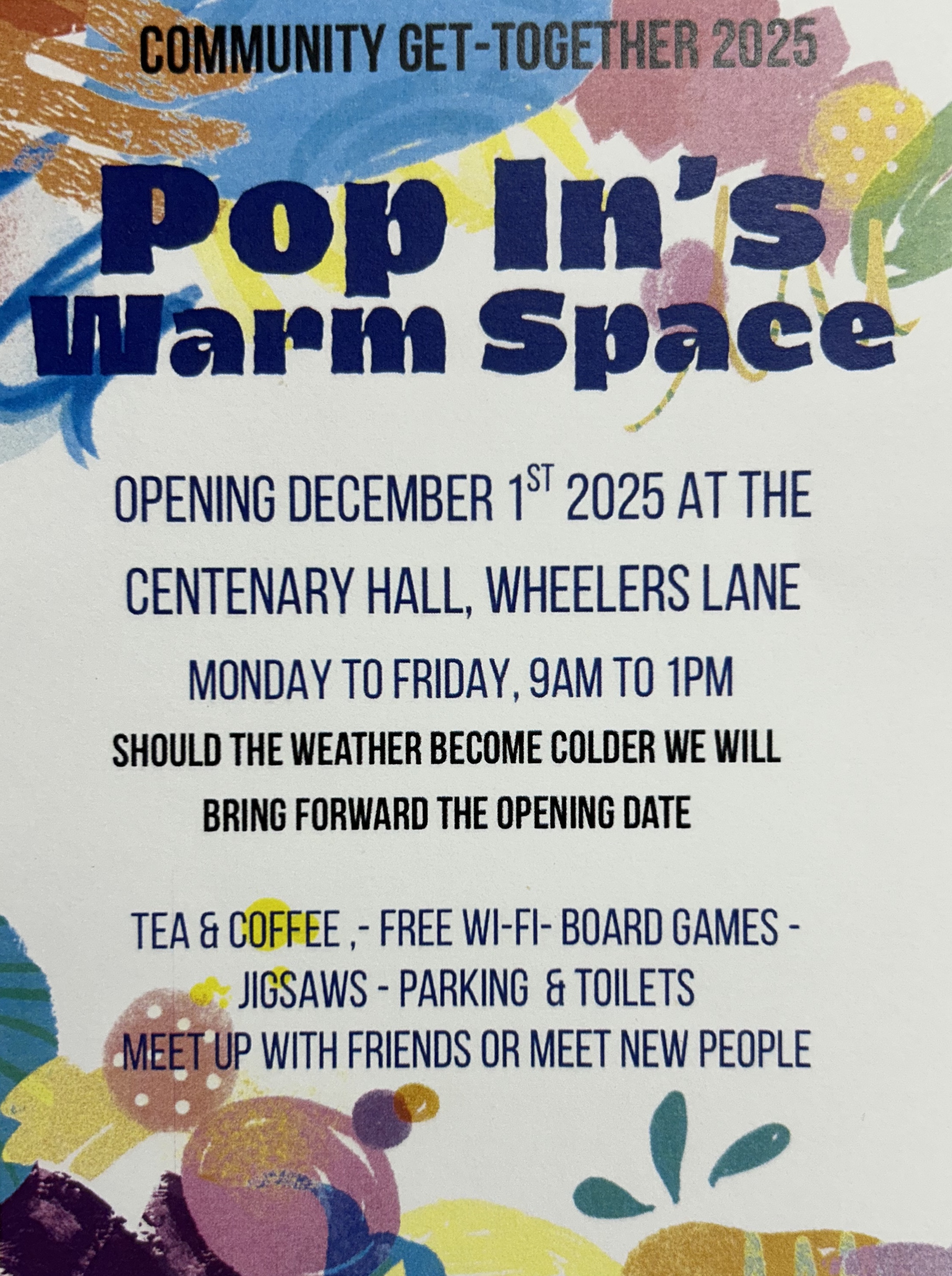 The Pop In warm space is being run again this winter. Open weekdays between 9am-1pm at the Centenary Hall you can pop in for a hot drink, a chat or even play games in a warm environment.